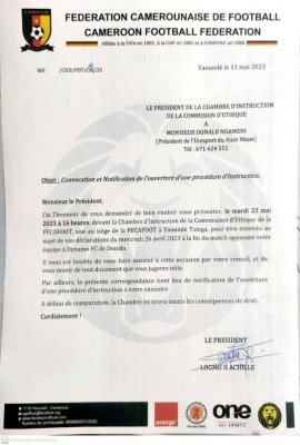Suite à ces sorties coups-de-poing, la Fecafoot a décidé de réagir. En effet, via une correspondance en date du 11 mai 2023, la Chambre d’Instruction de la Commission d’Ethique de la Fécafoot a adressé une convocation à Ngamenie « pour être entendu au sujet de (ses) déclarations » mardi 23 mai. Par ailleurs, le président va-t-en-guerre s’est vu notifier par l’institution « l’ouverture d’une procédure d’instruction à (son) encontre ». Une nouvelle affaire qui devrait sans doute faire encore jaser dans les prochains jours.