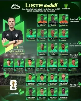 Le sélectionneur de la Mauritanie, Aritz López Garai, a annoncé la liste des joueurs retenus pour affronter le Togo et la République Démocratique du Congo, en éliminatoires de la Coupe du monde de la FIFA 2026, au cours d’une conférence de presse tenue le jeudi 13 mars 2025.