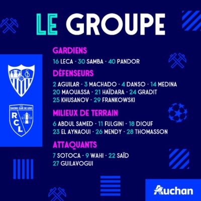 22 ans après sa dernière participation, le RC Lens va retrouver la Ligue des Champions mercredi soir à Séville. Pour cette rencontre de prestige face au récent vainqueur de l’Europa League, les Sang et Or pourront compter sur un groupe presqu’au complet. Malgré une incertitude qui régnait il y a encore quelques heures, Andy Diouf sera bien du voyage, et devrait être aligné d’entrée, lui qui n’a eu que quelques minutes dans les pattes face à Metz samedi dernier afin d’être ménagé.